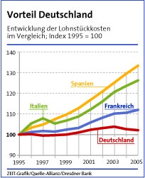Das beste Maß, die Veränderung des realen Wechselkurses zu messen, sind die Lohnstückkosten. Sie zeigen, wie günstig ein Produkt herzustellen ist und sie sinken, wenn die Löhne der Arbeiter langsamer steigen als ihre Produktivität wie es in Deutschland seit Jahren geschieht. Damit werden die Firmen und ihre Produkte international wettbewerbsfähiger. So gesehen wertet Deutschland seit 1995 gegenüber den anderen Euro-Mitgliedsländern ab. Das verärgert den Rest der Gemeinschaft.