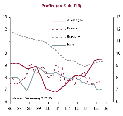Dabei dürfte die deutsche Industrie ihre Wettbewerbsfähigkeit inzwischen wieder vollständig hergestellt haben. Dafür sprechen die Lohnstückkosten, die um knapp zehn Prozent unter dem Durchschnitt der vergangenen 30 Jahre liegen. Dafür sprechen auch die Marktanteilsgewinne: Seit Mitte der neunziger Jahre haben deutsche Produkte ihren Marktanteil innerhalb der Währungsunion von 25,3 auf 27 Prozent gesteigert; Italiens Marktanteil ging von 13 auf 10,6 Prozent zurück, der französische von 17,2 auf 14,5 Prozent. Selbst bei den Gewinnen nehmen die deutschen Firmen seit vergangenem Jahr die Spitzenstellung in Euroland ein: Was am Ende in der Kasse blieb, machte 2005 gut 9,5 Prozent des Bruttoinlandsproduktes aus, in Frankreich nur 7,7 Prozent, in Italien sieben Prozent.